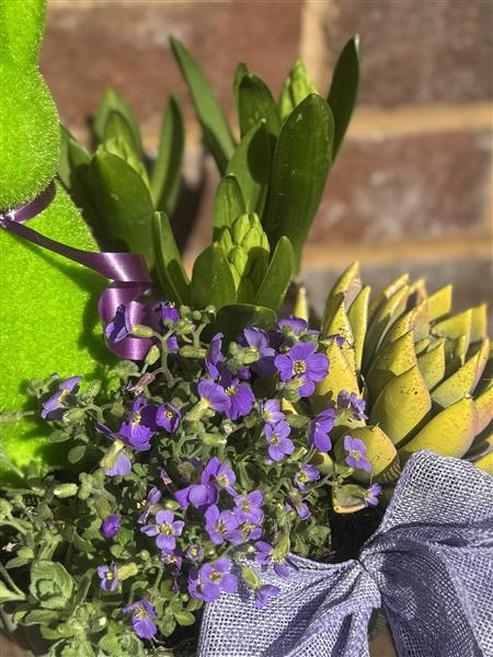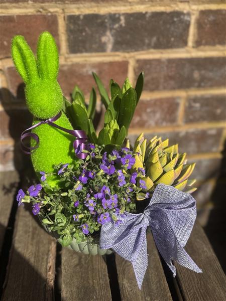 Lovely Easter Planter, overflowing with seasonal plants and faux bunny.
