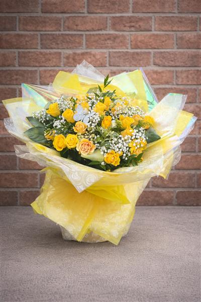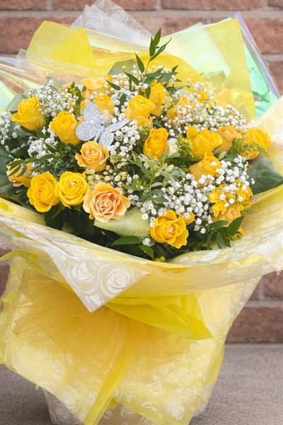 A stunning bouquet of yellow roses with foliage and gypsophilia, a perfect gift for any special occasion!